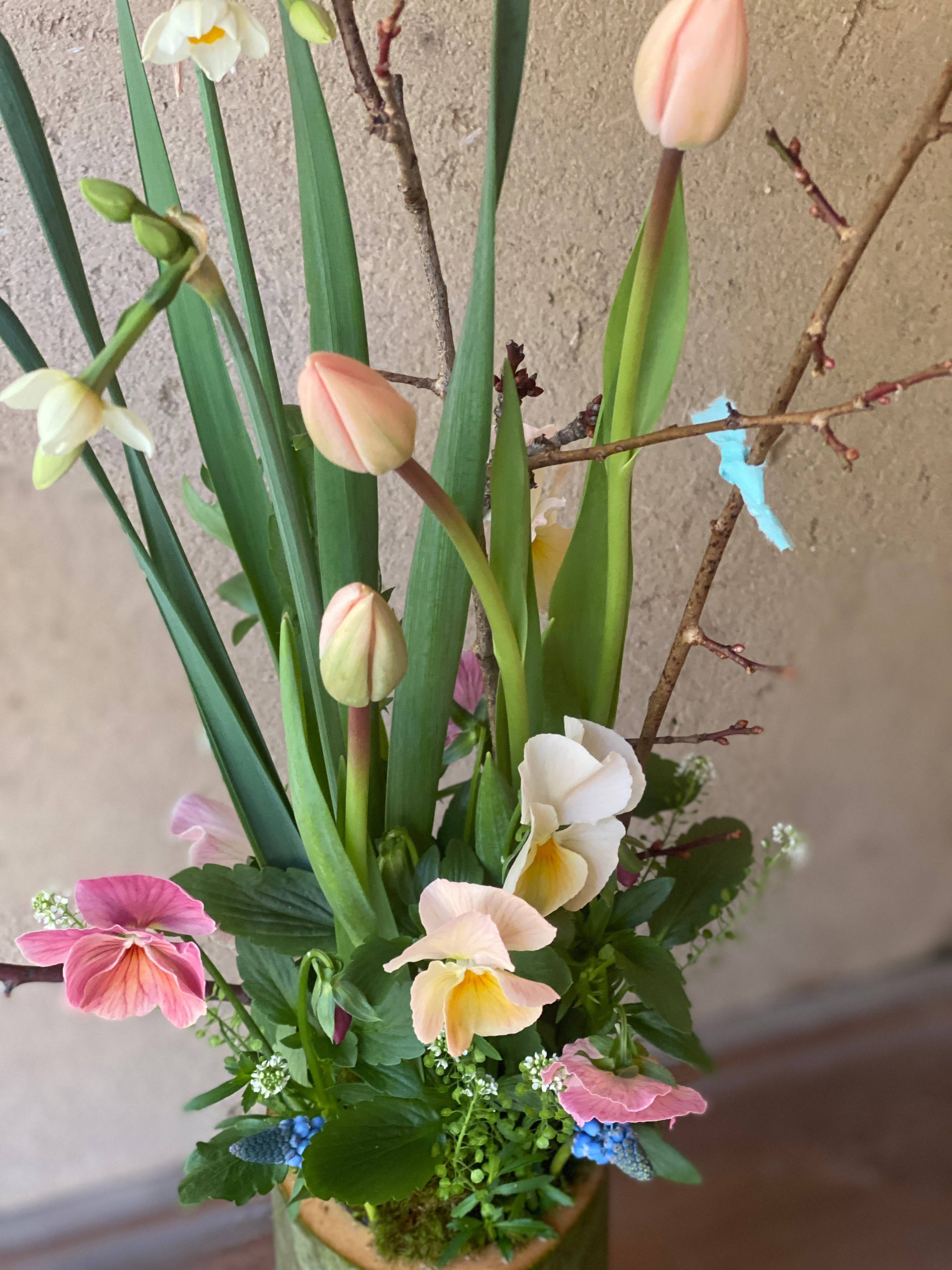 竹をスパッと切り、こみ藁を詰め、苔を敷いた器に、季節の樹木とお花をお入れします